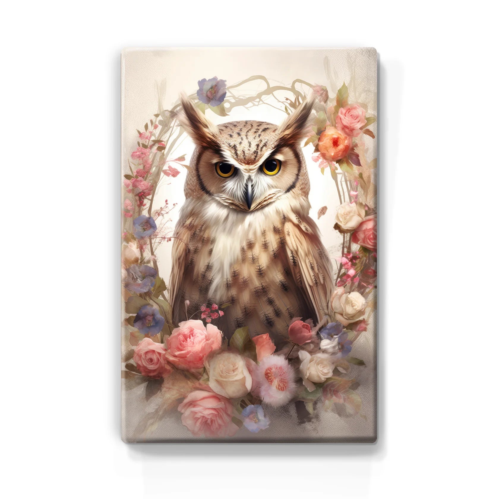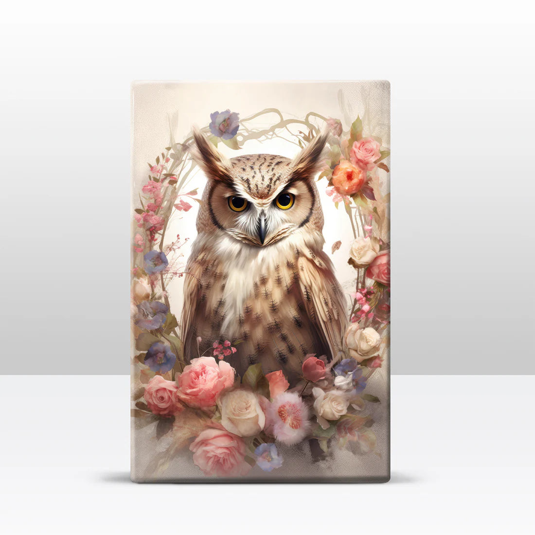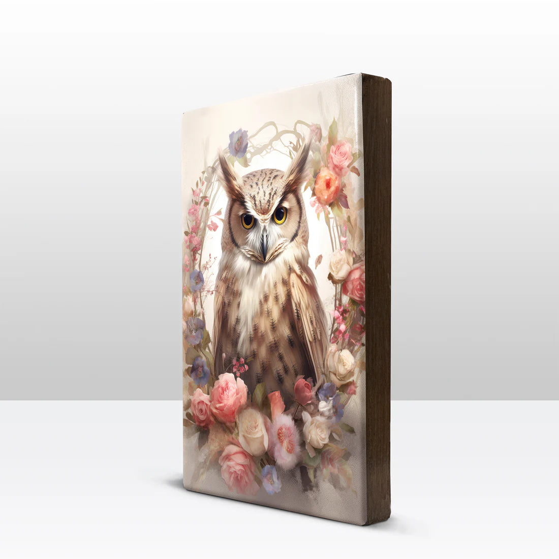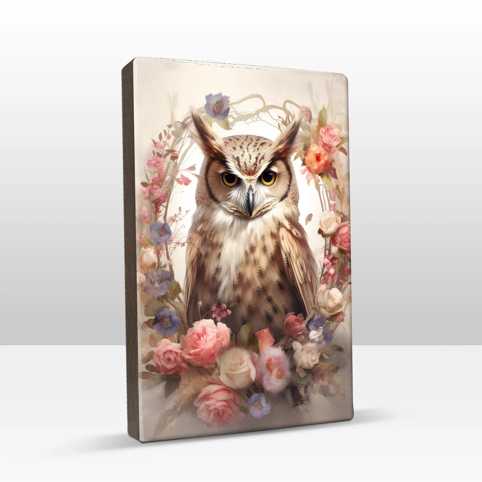 344. Uil in bloemenkrans op houten paneel(tje) groot