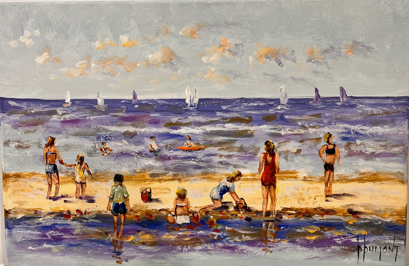 Dit schilderij toont een zonnige dag aan zee vol leven en beweging. Mensen genieten van het strand, kinderen spelen aan de waterlijn en verderop dobberen zeilboten op de golven. De zee is dynamisch geschilderd, met speelse penseelstreken die het licht en de beweging van het water vangen.