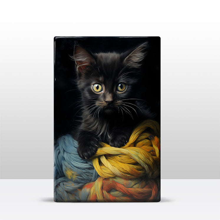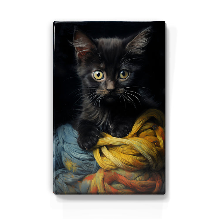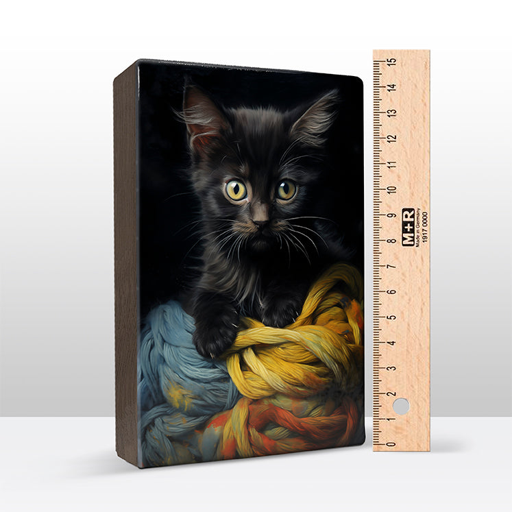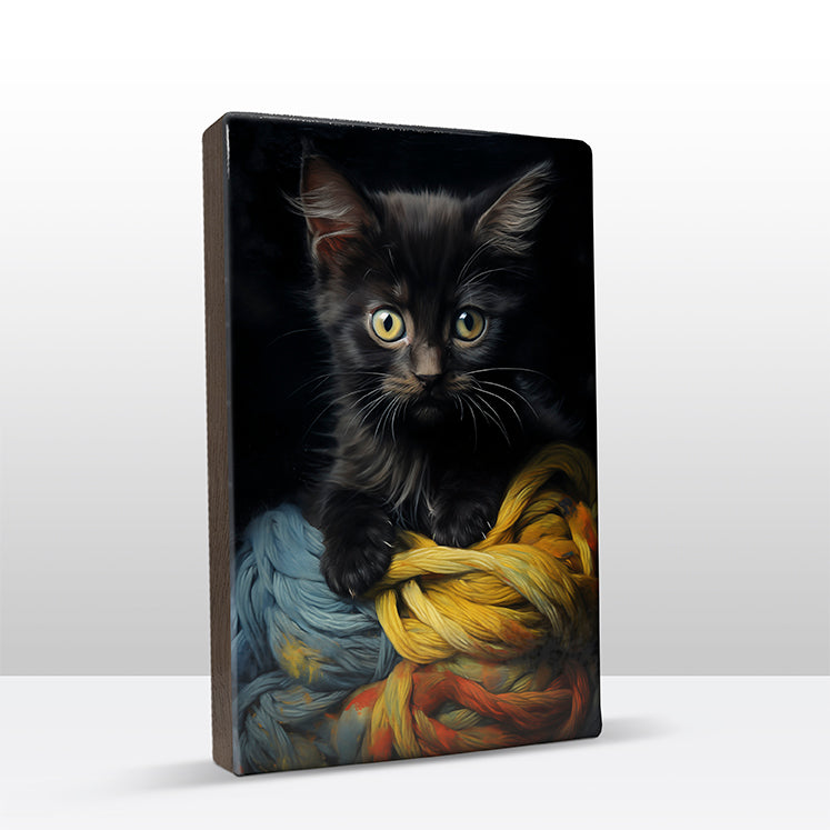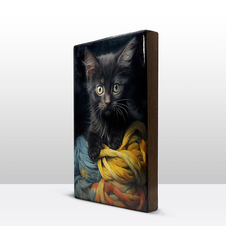 Artchoices exclusive: 93. Zwarte kitten met bollen wol op houten paneel(tje) groot