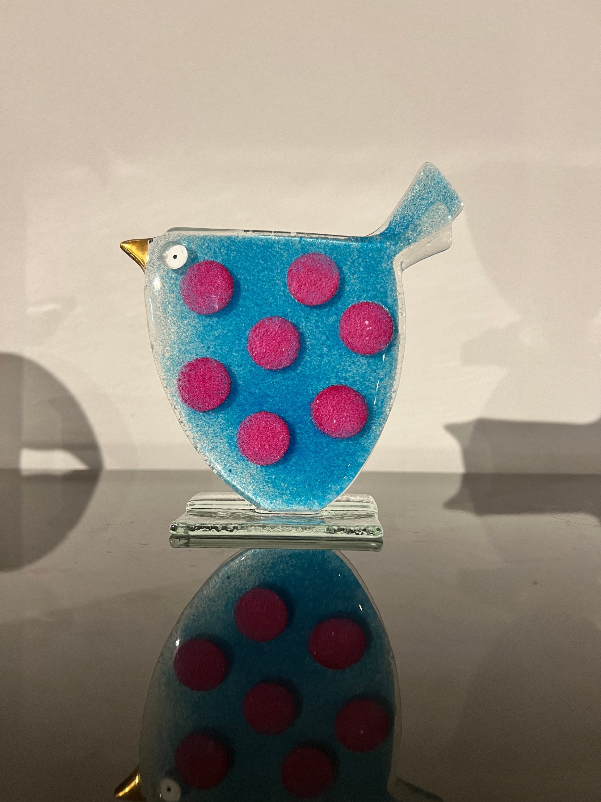 Dit vrolijke glazen vogeltje is een speels en kleurrijk decoratieobject dat meteen een glimlach op je gezicht tovert. De frisse blauwe kleur met opvallende roze stippen geeft het vogeltje een levendige en moderne uitstraling.