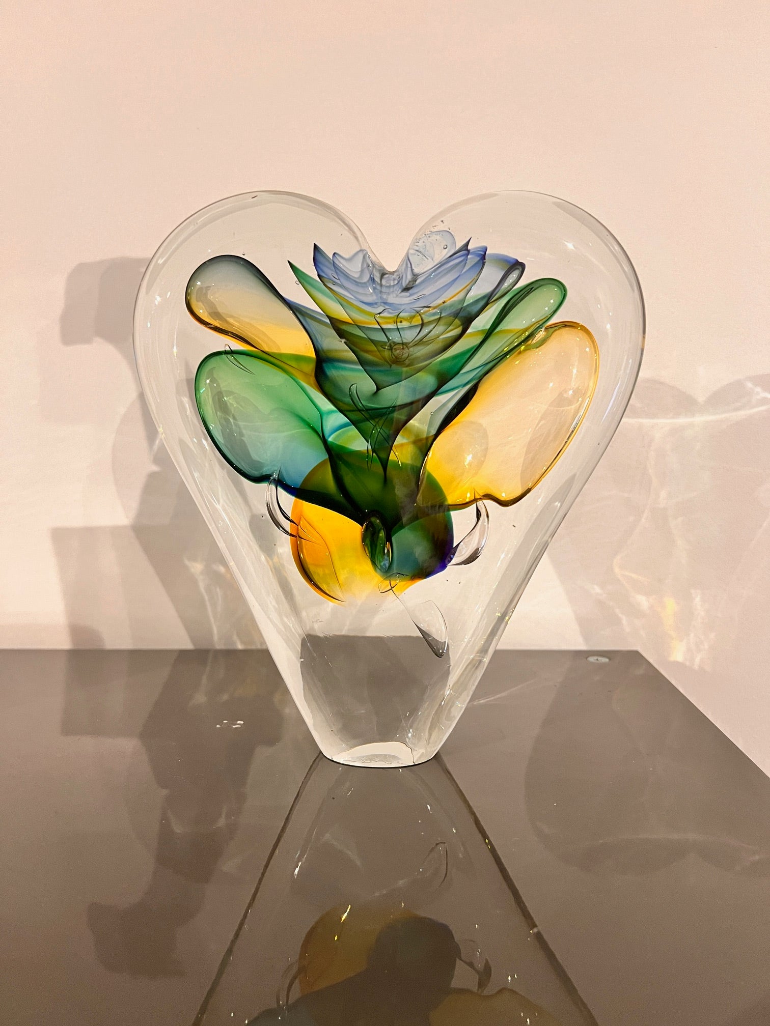 Dit bijzondere kristallen hart is een verfijnd kunstobject, met de hand vervaardigd uit hoogwaardig kristalglas. In het hart van het object ontvouwen zich vloeiende vormen en rijke kleuraccenten die prachtig samenspelen met het transparante kristal. Het licht wordt op subtiele wijze gevangen en weerkaatst, waardoor het hart vanuit elke hoek een andere uitstraling heeft.