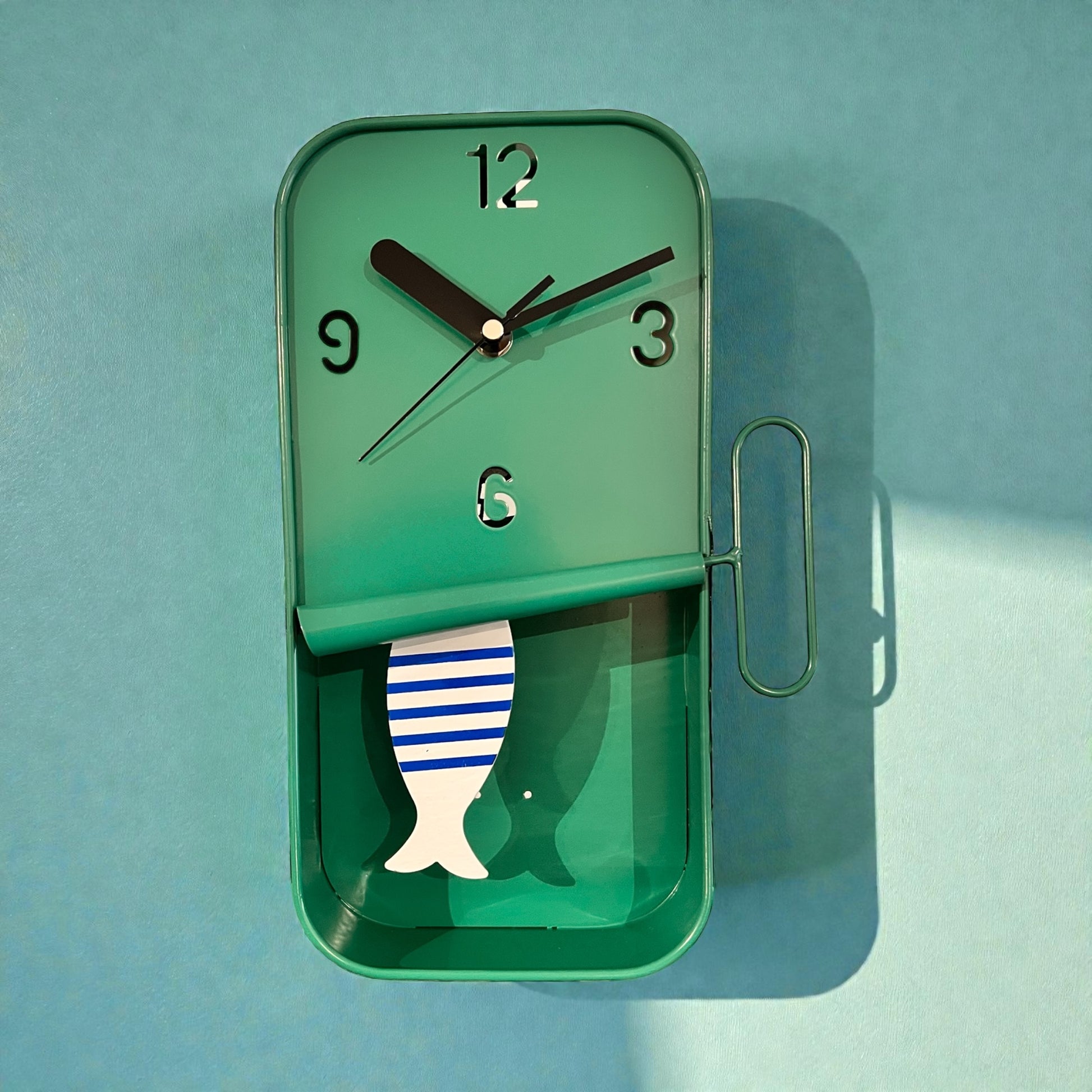 Wandklok met bewegend visje - groen met wit visje blauw gestreept
