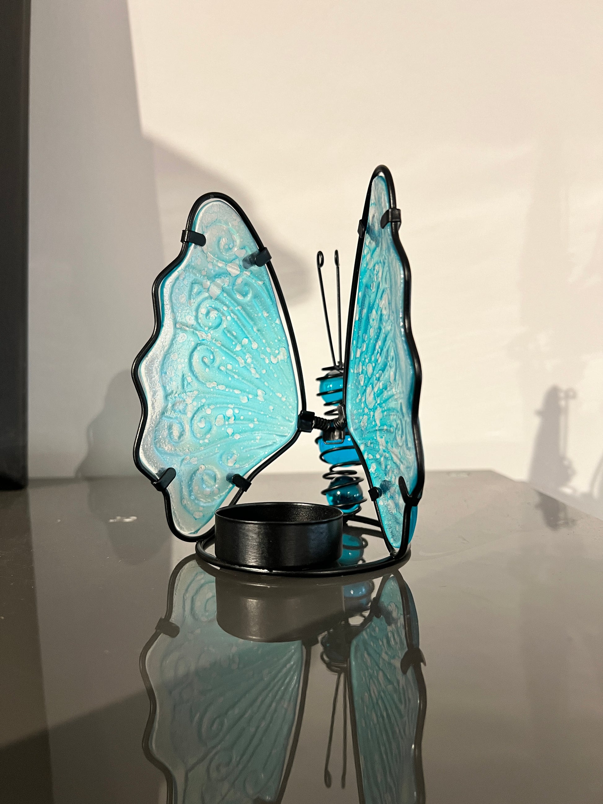 Glazen vlinder waxinelichthouder – turquoise