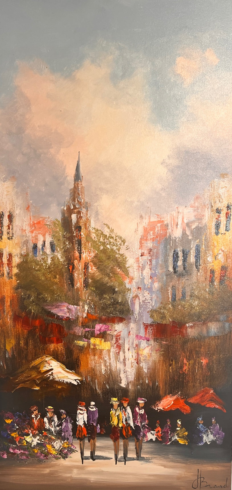 Dit schilderij toont een sfeervol stadsgezicht waarin architectuur, mensen en licht samensmelten tot een expressief geheel. Op de voorgrond bewegen elegante figuren langs kleurrijke bloemenkramen, terwijl de stad hoog oprijst in losse, gelaagde penseelstreken. De verticale compositie versterkt het gevoel van diepte en stedelijke grandeur.