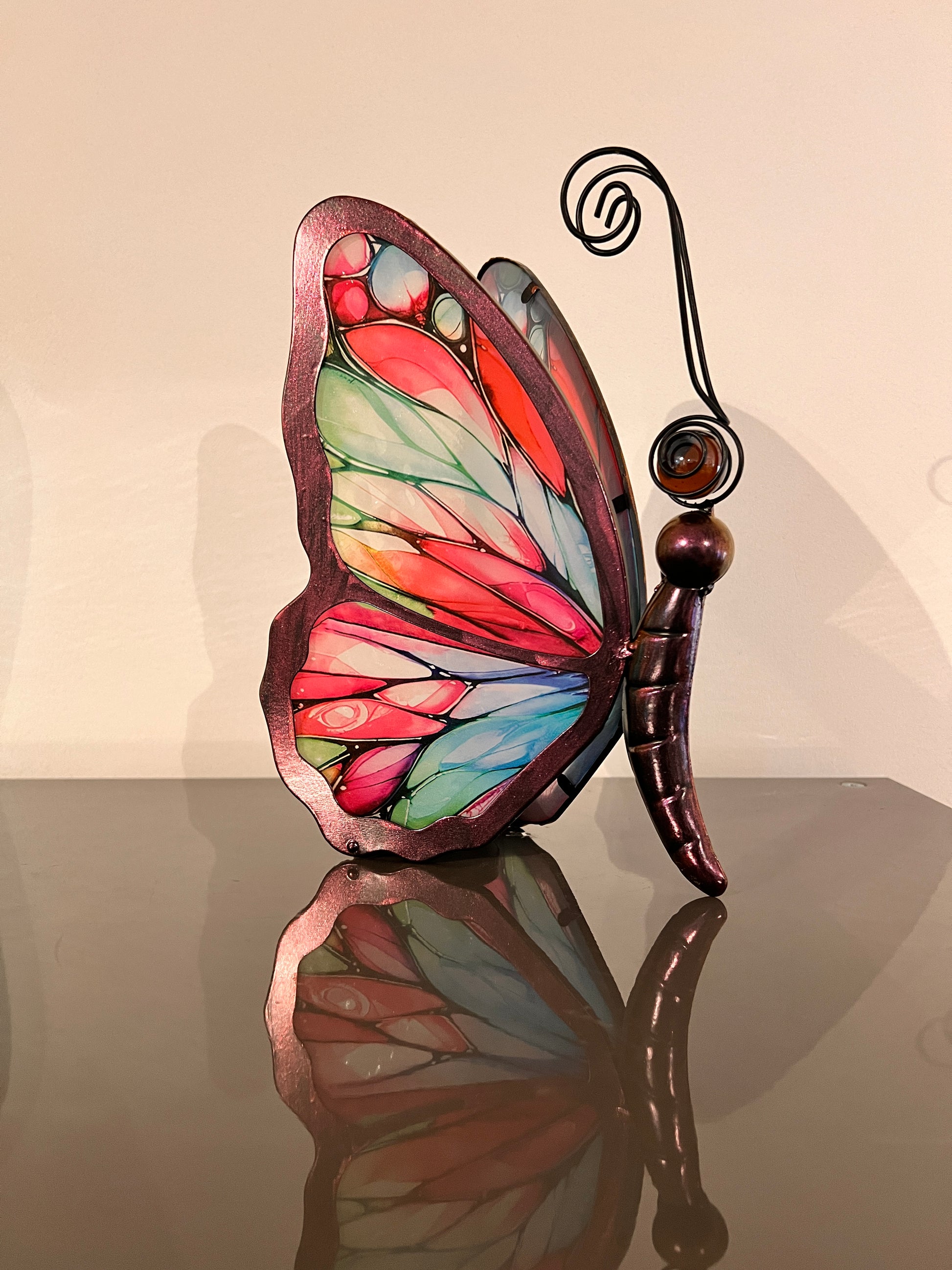 Deze prachtige XL multi-color vlinder brengt direct warmte, sfeer en kleur in elke ruimte. De gedetailleerde vleugels hebben een mooi kleurverloop van zonnig geel naar warm oranje, met lijnen die doen denken aan glas-in-lood. De metalen rand en het glanzende lijfje geven het geheel een luxe, handgemaakte uitstraling.