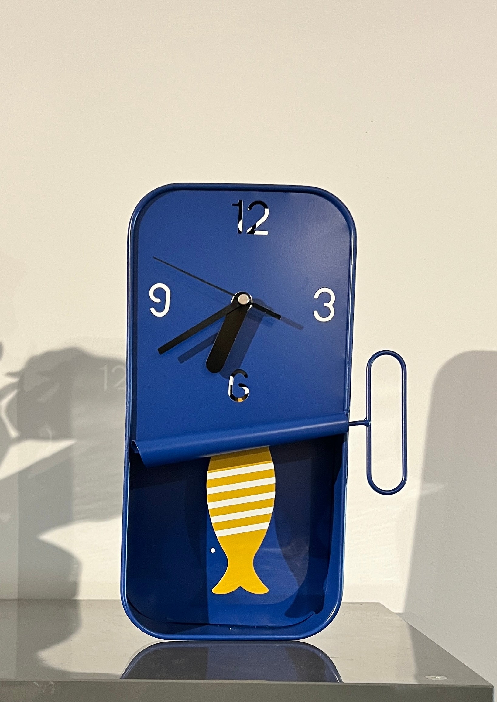 Wandklok met bewegend visje - blauw met geel visje wit gestreept